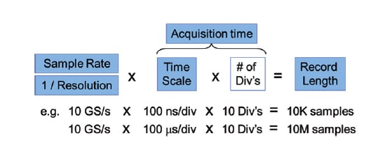 Memory depth of an oscilloscope is the primary determinant of how much “time” you can record. It is often referred to as Record Length for this reason. Many modern oscilloscopes come standard with “megasamples” of memory, which, considering that 10 years ago this was “kilosamples,” may seem adequate. But as devices combine elements that operate in “human time” (seconds and milliseconds) such as power supplies or control buses, and devices that operate in “machine time” (nanoseconds and picoseconds) such as I/O drivers, you can quickly run out of memory or create an improper setup for your signal. Because memory depth is intimately tied to the sample rate of the oscilloscope (see Figure 1), the common action of turning the scale knob on your scope to see more time may be impacting your measurements in many ways, including lowering your sample rate.