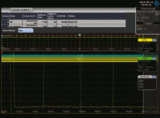 Method 1: Reducing the sample rate on the scope to view a large sequence of time. Since all oscilloscope measurements use a single time base, compromising time base to view multiple serial packets will also compromise the accuracy of the very item you might need to debug. This mix of high-speed items and slower items again presents a problem that deep memory can solve. In Figure 3, the I2C bus is operating at 100 KHz. A packet of date is sent about every 12 ms. Because the data and clock rates are slower, we can utilize a lower sample rate, but we need to be careful not to slow it down too much. In this example, we are viewing 20+ packets of data. The two examples in Figures 3 and 4 expose a glitch that is seen only with a high enough sample rate. The first capture (Figure 3) is taken at a 10 MSa/s rate. We might be forced to use a slow rate like this due to shallow memory on our scope. Alternatively, we might find this as an automatic setting chosen using the Autoset (or Autoscale) button on the oscilloscope. Unfortunately, there is a glitch that is not visible since the sampling rate is too slow to catch it.