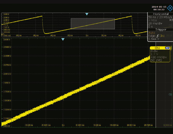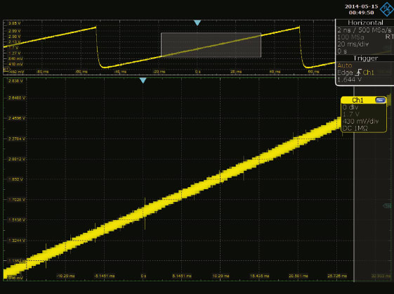 There are times when a noisy device in the system or a bad ground connection might cause high-frequency noise to be present on a signal. Although we might try to filter this, a common debug or validation task is to probe many different signals on the board to ensure we have done this properly, and aren’t sending a noisy signal to the rest of the system. Take, for example, the output of a slow-moving digital-to-analog converter (DAC) that controls part of a positioner or robotic arm. We want to ensure a clean signal is presented downstream after the filter you have in place, so a quick look with an oscilloscope should give this confidence. In Figure 5, a slow-speed signal is viewed with common settings, which presents a clean signal on first glance.