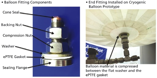 The end fitting is used as a fill-port for a superpressure cryogenic balloon prototype. The fill-port end fitting is a stainless steel component that has a circular flat region that holds the gasket in compression against the balloon film material; a raised annular section on the circular flat region that compresses the seal by 67% in the assembled configuration; a 37° cone connection on the fill port that seals with a common AN fitting attached to the gas supply; and a threaded stem that uses a nut and flat washer to compress the seal during installation into the balloon. The fitting uses a Gore GR expanded PTFE gasket that is 0.063-in. (≈1.6-mm) thick to seal the balloon film material against the balloon fitting.