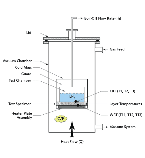 When steady-state conditions are achieved, the steady-state heat flow (Watts) is known for the prescribed boundary temperatures and test environment. The layer temperatures are also recorded. From one single test, the heat flux and ke are calculated (as previously described for cryostats), and large quantity of individual λ points (up to the factorial of one less than the number of sensors — (n–1)!) to generate a plot of λ versus temperature.