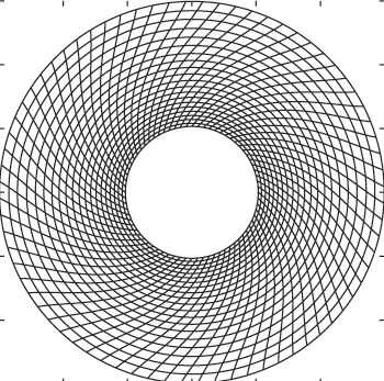The figure presents results of application of the method to a two-dimensional annular region. This example illustrates the clustering of grid points near the inner boundary of the annulus. It also illustrates how the grid evolves automatically with one or more time-varying boundary condition(s) — in this case, rotation of the inner boundary relative to the outer boundary or vice versa. In a case involving time-varying boundary conditions, the solution at each time step serves as a starting point for the solution at the next time step.