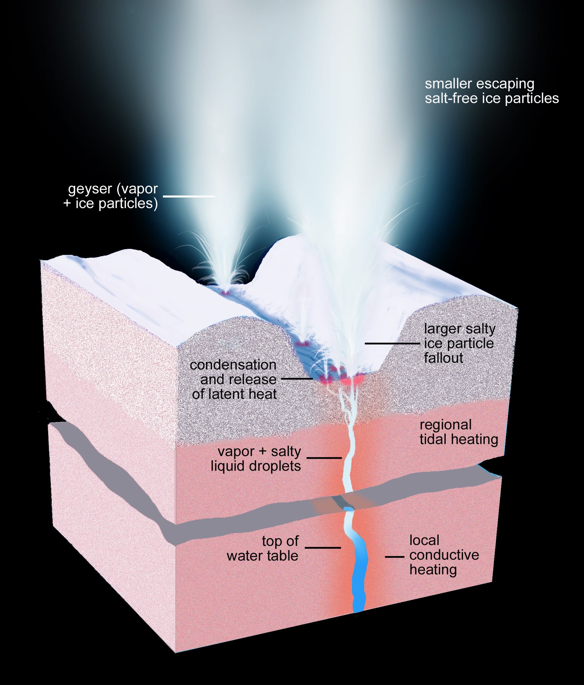 Thanks to recent analysis of Cassini gravity data, the researchers concluded the only plausible source of the material forming the geysers is the sea now known to exist beneath the ice shell. They also found that narrow pathways through the ice shell can remain open from the sea all the way to the surface, if filled with liquid water.