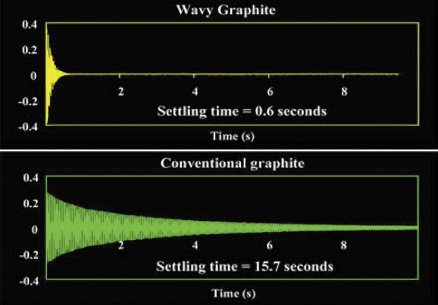 When the shaft is placed under load, opposing waves from its wavy fiber composite layers cause a significant amount of shear stress in the viscoelastic adhesive sandwiched between these layers. This greatly enhanced shearing of the viscoelastic is what causes high damping in the structure. The shearing action causes stretching of the long chain polymers in the viscoelastic to not only create the high-damping effect, but to generate heat and dissipate energy for longer drives off of the tee.