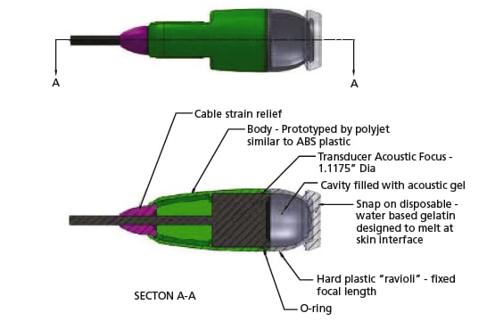 For the alpha prototype, it was important to develop an evaluation system that makes it easy to test in a broad range of contexts. In order for the transducer to couple with skin, it was decided that at the tip of the transducer housing, a flexible “ravioli” interface containing acoustic gel would be used. For the electronics housing, the design was based on wanting to adjust four parameters using uncomplicated controls: ultrasound frequency, pulse repetition frequency, pulse length/duration, and stimulus length. For the initial prototype, there were three defined points for these parameters that were achieved using adjustable potentiometers for each parameter. The electronics housing has a simple design with a power cord, on/off master power switch, coax transducer attachment, and a “deliver therapy” button.