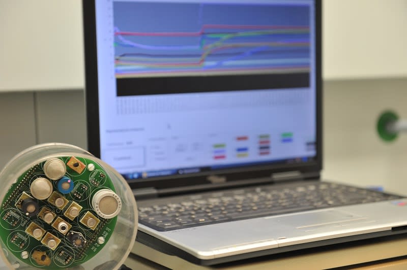 The nose is composed of 15 commercial sensors, a data acquisition system, and a computer connected to this system. Through the sensors, the nose "smells" the gases in the atmosphere and further processes the data, through pattern recognition, to warn of the presence of gas.