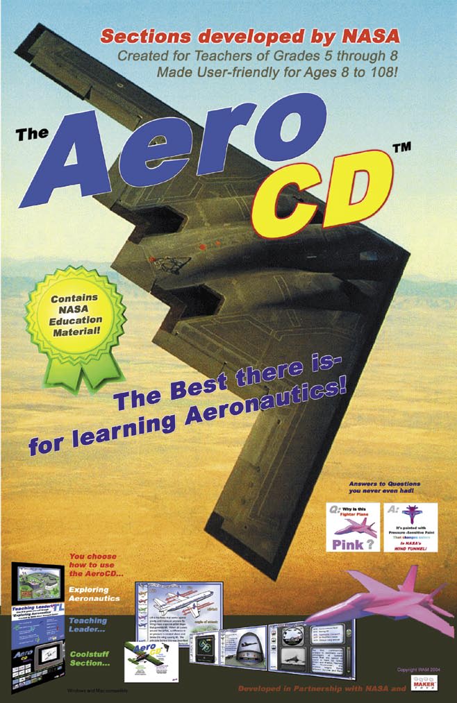 MakerToys also developed a second CD as a companion to the AeroCD called AeroLP. Its purpose is to provide a database of NASA facts about how things fly for people who want to teach small groups—such as teachers, pilot instructors, and scout leaders—or for individuals who just want to have a reliable information source for their own knowledge. For those who simply want to learn the basics, MakerToys has simplified titles and created a bookmark system for quick access to specific subjects, like aircraft types, classifications of aircraft by speed, and flight regimes, for example. In all, the AeroLP gives users 887 pages of printable material to create their own curricula.