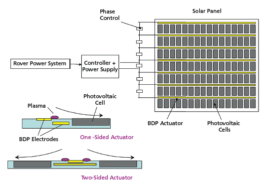 Photovoltaic cell arrays are used on robotic rovers on the Mars surface, but dust accumulation on the surface of the solar cells reduces their exposure to light radiation and thus degrades their performance. Dust that accumulates without being removed limits the life of the rover’s power systems. Similarly, terrestrial solar arrays suffer from dust accumulation, especially when located in desert areas, which reduces their effectiveness. Technologies for re moval of the dust or preventing it from settling have been proposed and are being researched, but none were yet implemented on the rovers. These techniques include mechanical means, blowing stored gas, blowing pumped gas, electrically charging the surface, repelling the dust, and other techniques.