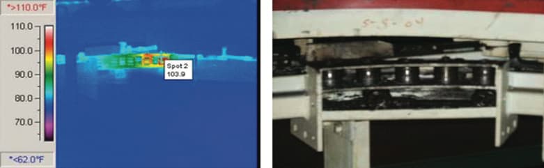 The V8 engine assembly process is terminated on a “power and free system” in which the finished engines are marshaled and sorted for shipment by automated equipment. Within the system, many dips and turns have been incorporated to facilitate the 15 miles of chain needed to accomplish this task. Turn roller failure (Figures 2 and 3) and an overheated chain (Figures 4 through 7) were two problems that were resolved with proactive repairs before they could cause major downtime. If allowed to run to failure, these problems would have necessitated more costly and time-consuming reactive repairs.