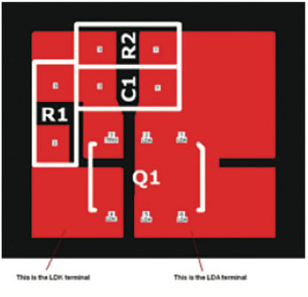 To help clients understand how individual components within the kit should be connected together, and connected to a laser diode, Pangolin has published the circuit layout of their LASORB through-hole part. The circuit layout clearly identifies all components in the LASORB SMT KIT including all resistors (R1, R2), capacitors (C1) and the TSOP6/4G-20V semiconductor.