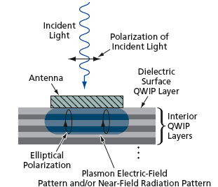 For a given QWIP, the metal and the size and shape of the antenna would be chosen so that the combination of the antenna and the adjacent surface dielectric layer of the QWIP would support surface plasmon states at wavelengths of interest. The interface between a dielectric and a metal can support a surface electromagnetic wave if the permittivity of the metal, expressed as a complex number, has a negative real component. The distribution of amplitude in a plasmon peaks at the metal/dielectric interface and decays exponentially with distance from the interface into the metal or the dielectric.