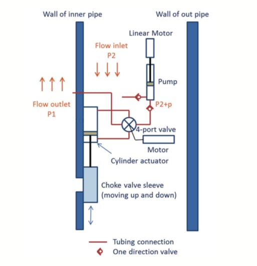 The specific solution for application to oil down-hole flow consists of a 4-port valve that is able to connect the pressure of inlet P2 and outlet P1 to a cylinder actuator to drive a sleeve choke valve that controls the flow from the outside of the inner pipe to the inside. A small pump is inserted into the high-pressure (P2) connection line in order to produce additional pressure difference of p and to increase the P2 to P2 + p in case the pressure difference of P = P2 – P1 is not large enough. In this configuration, the 4-port valve has three positions for three different outcomes.