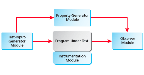 The test-input-generator and property-generator modules must be constructed specifically for the program under test. It may be possible to automate the construction of the instrumentation module, depending on the nature of the program under test. The observer module is generic and can be re-used for testing other programs.