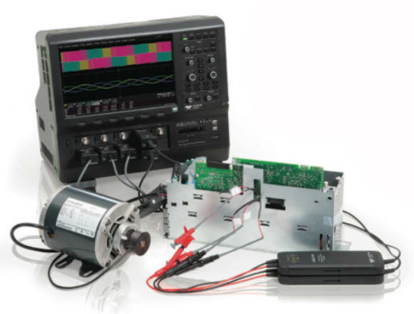 The oscilloscope with Motor Drive Power Analyzer software permits waveform captures from the drive power section, individual power transistors, and embedded control system, and performs coincident three-phase power analysis of the power section waveforms in one instrument, enabling debug and analysis of all aspects of the complete motor drive.