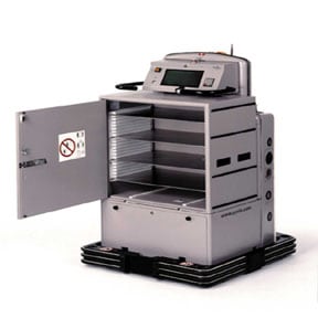 The Pyxis HelpMate® SecurePak robotic courier navigates autonomously throughout medical facilities, transporting pharmaceuticals, laboratory specimens, equipment, supplies, meals, medical records, and radiology films between support departments and nursing floors.