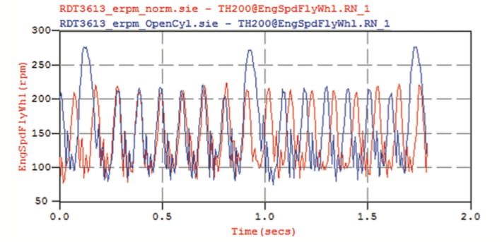 The plot in Figure 1 shows the engine cranking speed of the vehicle’s 548-cubicinch, V8 engine over a two-second time period. The compression ratio of the engine is 15:1. While the average cranking speed is 150 rpm, it can be as high as 225 rpm during a power stroke, and as low as 85 rpm during a compression stroke. At a cranking speed of 150 rpm, the crankshaft makes 2.5 revolutions per second. For the 4-cycle, V8 engine, there are ten power strokes during a one-second period, as shown in the plot.