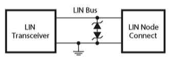 A LIN transceiver has signal ranges from +24/–15V and data rates of 2.4 kbps to 20 kbps. It needs a bidirectional asymmetrical TVS configuration to protect the two wires in a differential mode. Multiple TVS diodes can be connected in anti in-series mode to protect the two wires from surge events. An alternative solution that offers the same power handling capability involves adding a bi-directional TVS diode to protect the LIN bus.