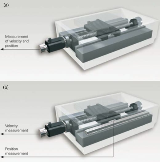If a linear encoder is used for measurement of the slide position (Figure 3b), an increase in the ball screw’s temperature has no influence on accuracy. This is referred to as operation in a closed loop because the mechanical errors of the drive are measured in the position control loop and are therefore compensated.