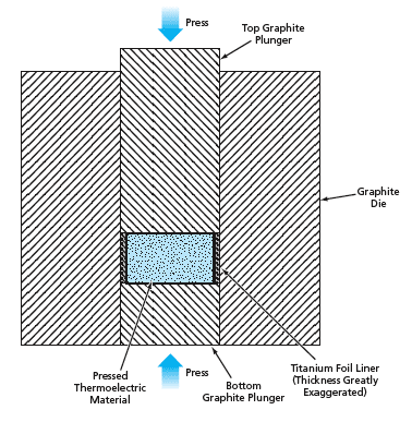 Guided by the aforementioned experiments, a powder-metallurgy process for fabricating skutterudite was modified to provide for covering the outer surfaces of the segments with titanium foils. In the unmodified process, the thermoelectric material, in powder form, is hot-pressed in a graphite die, then removed, then further processed. The combination of high temperature and pressure in the die acts to promote bonding between particles, and as such, is ideal as a means of adding an adherent sublimation- suppressing outer layer. Hence, the process is modified by simply lining the inner wall of the die with a foil of the barrier material before filling the die with the thermoelectric powder (see figure).