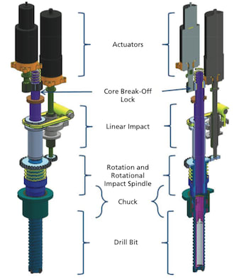 The tool takes advantage of the inherent brittleness of rocks by combining dynamically generated impact loading to facilitate rock fracture with a rotation DOF for cuttings removal. The tool can be implemented on a variety of landed platforms with low force and power capabilities, and can increase in complexity to provide additional tool usage flexibility and efficiency.