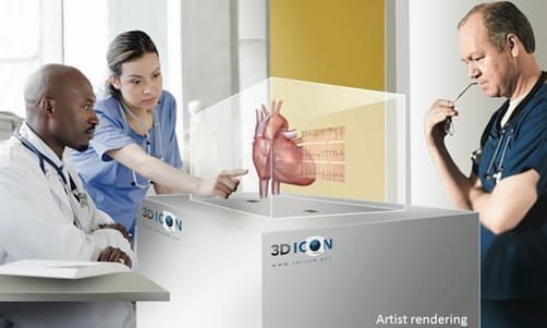 3DIcon is developing a glasses-free 3D volumetric display, otherwise known as a static volume display. The display consists of a rare earth-doped transparent image chamber material and two infrared scanning lasers used to excite the rare earth ions and create visible light emission. The two lasers are computer controlled using available 3D data provided from a variety of sources. The scanning lasers create an image of the available data in the image chamber that can be observed on all sides by one or more viewers. The approach used by 3DIcon to illuminate the image chamber material with infrared radiation increases the number of light emitting voxels (volumetric pixels) to a resolution as high as 800 million, which is sufficient to provide still images, animation, and video from 3D volumetric data.