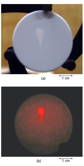 The strategy for producing delamination- indicating TBCs relies on the enhanced luminescence produced by regions of the TBC where subsurface cracks are propagating. This enhanced luminescence is due to a large fraction of the excited luminescence that is incident upon the crack at an angle beyond the angle for total internal reflection. Deposition of 125-μm thick TBCs above a 7-μm thick europium-doped layer was performed in collaboration with Penn State University. These self-indicating TBCs were deposited by multiple-ingot electron-beam physical-vapor deposition without disrupting TBC growth so as not to alter the usual columnar growth that gives these TBCs many of their desirable properties. To demonstrate delamination indication, localized TBC delamination was induced by scratching the coating with a stylus.