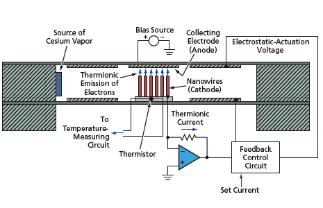 The bias potential would be applied to the anode and the temperature of the array (the cathode) would be measured by the thermistor. Because of the thermionic reduction of temperature is expected to be small in initial experiments, the sensitivity of measurement of this reduction would be enhanced by use of a lock-in technique in which the bias potential would be modulated and the variation in temperature measured at the modulation frequency.