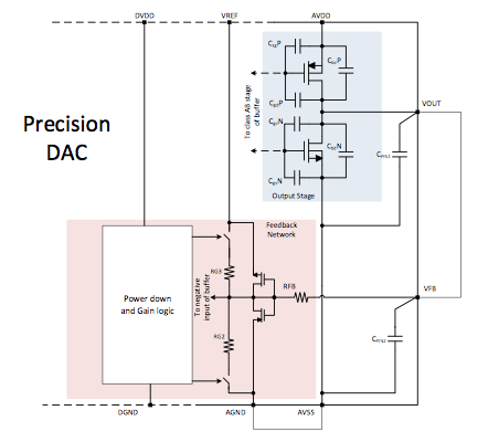 The NFET/PFET transistors in a DAC’s output stage are much larger versus other switches because the output stage is designed for a certain load drive. Therefore, parasitic capacitances of these FETs are much higher than other on-chip components. Figure 1 shows a simplified diagram of a typical precision DAC’s output stage (DAC8760). This diagram assumes separate power supplies for output stage and the chip’s digital core. The diodes on the feedback node are placed to protect the transistors in gain/power down network.
