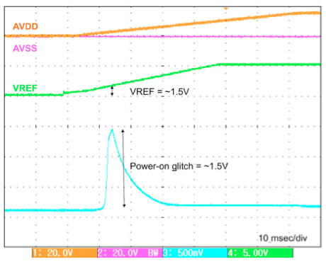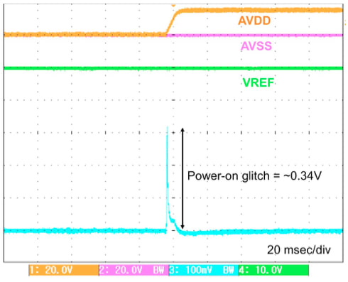 Figure 5 plots the power-on glitch with a resistive load of 500 KΩ to ground with these conditions: AVSS = 0V, AVDD = 15V, VREF = 0V (sequenced after AVDD), ramp time (dt) = 7 msec, CPARP ~320 pF. The estimated power-on glitch magnitude in equation (4) is 0.34V.