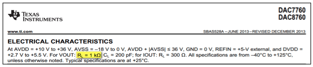 Choosing a small resistive load, equation (4) can reduce the power-on/off glitch magnitude to sub-mV levels. This leads to significant current flowing through the output buffer, causing degradation in the VOUT accuracy specs such as offset, gain, linearity, and so on. Therefore, choose the resistive load at the VOUT pin according to datasheet specifications. For example, the DAC8760 datasheet specifies accuracy parameters with a load of 1 kΩ (Figure 4).