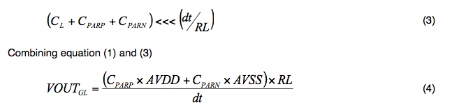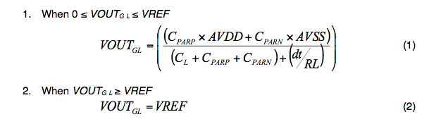 Where VOUTGL is the magnitude of the glitch, CPARP, CPARN, and CL are the parasitic and load capacitances, respectively. AVDD/AVSS = power supplies, VREF = reference voltage, RL = load on the VOUT pin, RFB = feedback resistor inside the chip, and dt = ramp time for AVDD/AVSS supply.