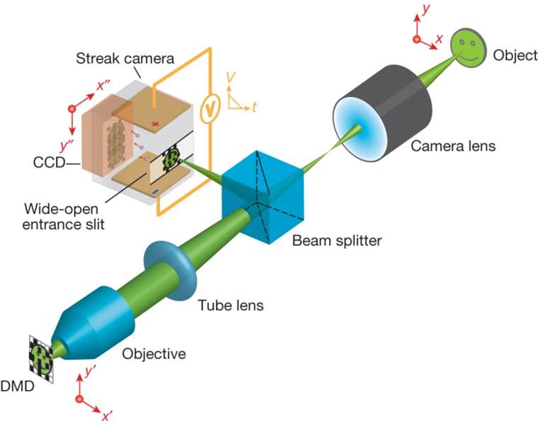 In order to capture a 2D event using a streak camera, the camera’s narrow slit needed to be widened. Yet doing so would be detrimental to the temporal resolution. To get around this, a technique called compressed ultrafast photography (CUP) was used.