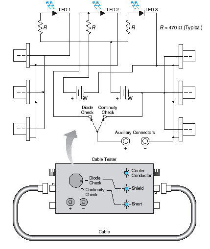 As soon as both ends of the cable are plugged into the tester, the cable completes the circuits through the aforementioned components. Then LED 1 lights or does not light up, indicating continuity or discontinuity, respectively, in one wire (the center conductor in the case of a coaxial cable). Similarly, LED 2 does or does not light up, indicating continuity or discontinuity, respectively, in the other wire (the shield in the case of a coaxial cable). If LED 3 lights up, then this is an indication that there exists an undesired current path (a short circuit) between the two wires in the cable.