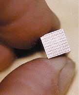 A TCU is a thermopile made from state-of-the-art thermoelectric materials — in this case, p- and n-doped, vacuum-hot-pressed bismuth telluride. The present developmental TCU is fabricated as a module (see Figure 1) that contains an 18-by-18 square array of alternating p- and n-doped pieces of bismuth telluride separated by pieces of polyimide film. Each element of the array is a square 0.015 in. (0.38 mm) wide. The overall dimensions of the module are 0.291 by 0.291 by 0.9 in. (7.4 by 7.4 by 22.9 mm). The elements of the array are electrically connected in series by gold contact strips on the hot and cold sides. The design hot and cold junction temperatures are 250 and 25 °C, respectively.
