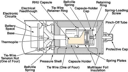 Figure 2 is a simplified cross section of a proposed RTG that would incorporate the developmental TCU. The RHU capsule would be contained in an aluminum capsule holder, which would be mounted in contact with the TCU and pressed against the TCU by tension in four spring-loaded titanium tie wires. The RHU capsule would be spring-loaded to keep it stationary within the holder in the presence of shock and vibration and to minimize thermal resistance between the RHU and the TCU. A thermally conductive electric insulator (made of boron nitride) would be placed between the capsule holder and the hot side of the TCU to prevent electrical short-circuiting of the TCU. Thermal insulation for the hot parts of the RTG would comprise multiple layers of aluminized polyimide film interspersed with layers of ceramic paper. The interior of the RTG could be either evacuated or else filled with xenon.