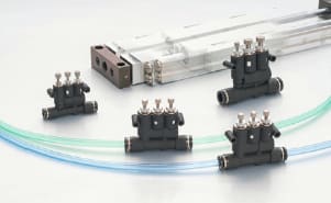 PISCO USA (Elmhurst, IL) offers a flow controller that features a built-in shock absorber function. It uses a 2-stage speed control to regulate exhaust speed and absorb shock in pneumatic cylinders. The units have three needles to adjust the initial speed of the cylinder (first stage), speed of the brake (second stage), and timing of the speed shift. The second-stage speed provides a cushion and reduces the speed at the end of the stroke. This speed reduction lessens shock by up to 1/9 while retaining the same cycle time. The flow controller is available in 4-, 6-, and 8-mm metric sizes, and 5/32, ¼, and 5/16 inch sizes.