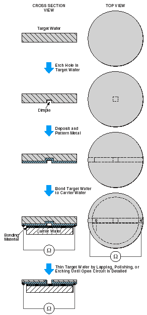 The carrier wafer would either be made of, or coated with, an electrically insulating material, and would have a diameter slightly less than that of the target wafer. The back side of the target wafer would be bonded to a face of the carrier wafer so that the carrier wafer could serve as a platform to hold the target wafer during processing to thin the target wafer. Because of the smaller diameter of the carrier wafer, the ends of the electrical conductor(s) on the target wafer would protrude slightly past the edge of the carrier wafer and would thus be accessible for measurement of electrical resistance. During processing, target-wafer material would be removed from the front side of the target wafer. Processing would be continued until the aforementioned increase in electrical resistance occurred.