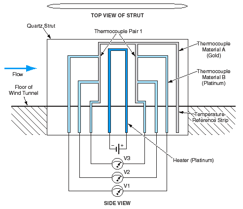 The number of thermocouple pairs can be as many as needed, up to a practical limit set by the number of alloy traces that can be patterned on the quartz surface. Also the miniaturization of a device of this type is limited by the capability for fine-line photolithography. Figure 2 depicts a working prototype. These devices could be batch-fabricated on quartz or other low-thermal-conductivity substrates at relatively low cost. These devices could be particularly useful for measuring flows on the surfaces of airplanes, in ventilation ducts, in jet aircraft engines (most importantly, for detecting incipient compressor stall), and in automotive engines.