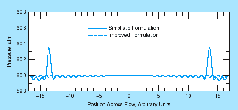 Although the superiority of the improved formulation has been shown by this test, caution is in order because the characteristic-wave analysis inherently incorporates the assumption that elliptic terms act only as corrections to an essentially hyperbolic operator. Thus, diffusional terms are not parts of the consistent- boundary-condition analysis, but are used in the governing equations once a solution is sought. The condition of weak ellipticity may not always be satisfied when thermal-diffusion effects are large enough to augment the effective thermal conductivity to the point of making heat diffusion processes comparable in magnitude to convective processes.