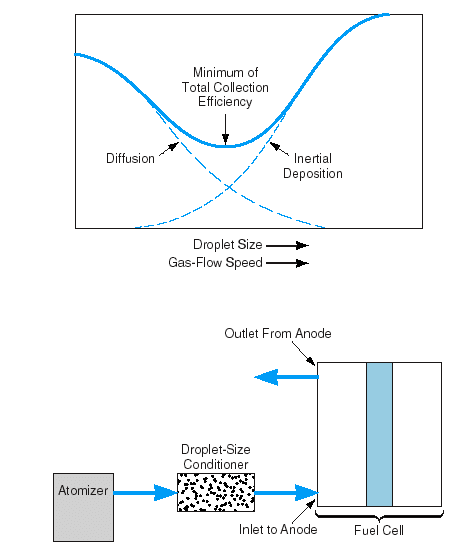 Control of droplet sizes would be important for the following reasons: During flow to the catalytic anode surface, some droplets of methanol would undesirably coalesce through the combined effects of diversion of the flow by some fuel-cell components, inertial deviation of droplets from deviated flow trajectories, and Brownian motion of the smallest droplets. To preserve the benefits of aerosol feed, it would be preferable to prevent the pores of the catalyst and the backing paper of the anode from becoming saturated with methanol, because if saturation were to occur, the anode would behave as in a liquid-feed cell, and crossover would rise substantially as a result. Minimization of droplet coalescence can prevent saturation. The quantitative measure of the tendency toward coalescence and saturation is called "collection efficiency," and it depends on droplet size and flow speed, as depicted in the upper part of the figure. One could minimize the collection efficiency by use of a droplet-size conditioner in the form of a porous diffuser, electrostatic separator, packed bed, or other device that would filter large droplets out of the flow, as indicated schematically in the lower part of the figure.