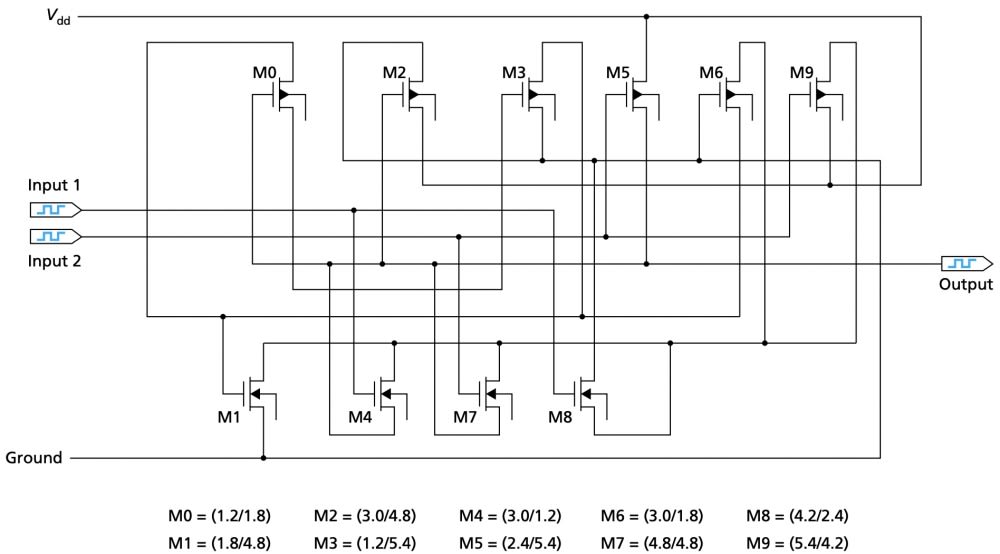 The figure is a schematic diagram of a complementary metal oxide/semiconductor (CMOS) electronic circuit that functions as a NAND gate at a power-supply potential (Vdd) of 3.3 V and as NOR gate for Vdd = 1.8 V. In the intermediate Vdd range of 1.8 to 3.3 V, this circuit performs a function intermediate between NAND and NOR with degraded noise margin. Like the circuit of the immediately preceding article, this circuit serves as a demonstration of the evolutionary approach to design of polymorphic electronics — a technological discipline that emphasizes evolution of the design of a circuit to perform different analog and/or digital functions under different conditions. In this instance, the different conditions are different values of Vdd.