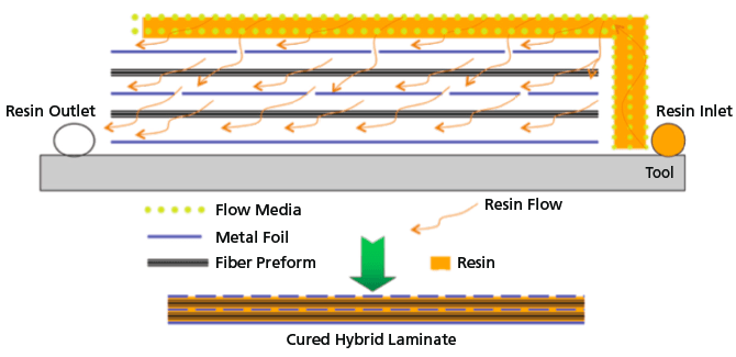 Current commercially available FMLs can be expensive to produce, and part size is limited due to the required prepreg and use of an autoclave or press in consolidation. However, infusing liquid resin into dry fabric layers solely by vacuum pressure to produce high-quality materials has proven to be a more cost-effective process for preparing composites. VARTM utilizes a flow distribution media to allow the resin to proceed rapidly on the surface over the length of the part, followed by the slower through-the- thickness infusion through the part, thereby decreasing infusion times.
