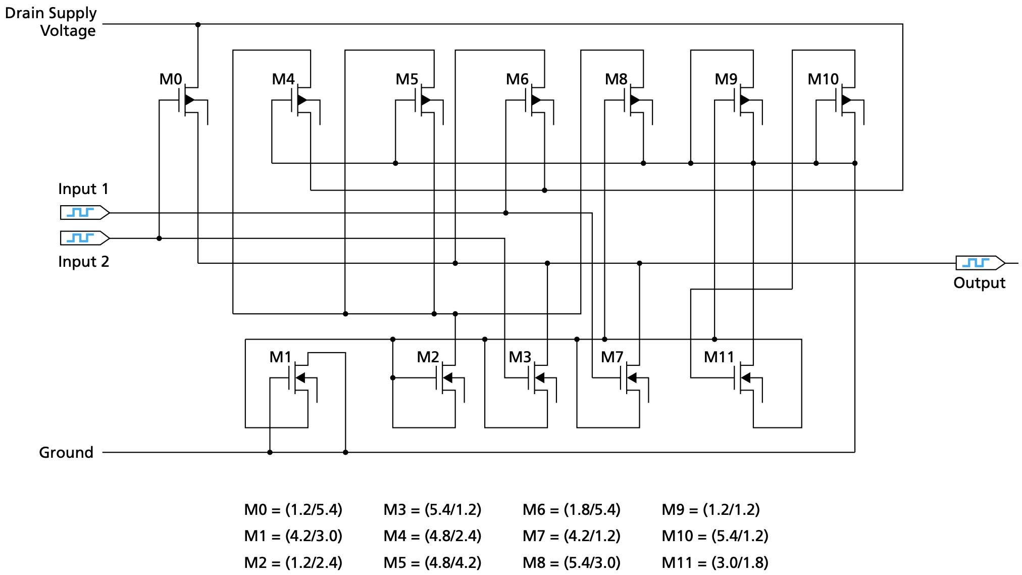 The figure is a schematic diagram of a complementary metal oxide/semiconductor (CMOS) electronic circuit that has been designed to function as a NAND gate at a temperature between 0 and 80 °C and as a NOR gate at temperatures from 120 to 200 °C. In the intermediate temperature range of 80 to 120 °C, this circuit is expected to perform a function intermediate between NAND and NOR with degraded noise margin. The process of designing the circuit and the planned fabrication and testing of the circuit are parts of demonstration of polymorphic electronics — a technological discipline that emphasizes designing the same circuit to perform different analog and/or digital functions under different conditions. In this case, the different conditions are different temperatures.