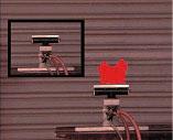 The light arriving at the CCD array sensors is transformed into electronic image data. The outputs of the CCDs are digitized and processed using proprietary algorithms programmed into an Altera programmable logic device. The background infrared (IR) image is then subtracted from the flame IR image. Filtering and thresholding algorithms isolate the flame pixels. The resultant isolated flame image is superimposed on the visible image, producing a red overlay on the visible image, denoting the location and size of the hydrogen flames. A digital-to-video encoder provides a standard NTSC (National Television Systems Committee) and S-video output. Multiple modes provide output of the color, flame IR, background IR, or overlay image. Figure 2 shows the overlay mode image with the flame represented in red. The inset shows a standard color video image for comparison. An additional output mode cycles among color, flame IR, and overlay images at a fixed interval. User control of the output mode is available via remote-control input or a switch on the rear of the camera.