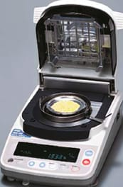 The MS-70 400-Watt halogen moisture balance from Tovatech (Maplewood, NJ) is designed for quality control when testing materials such as plastic resins, where moisture content specifications are tight. The thermogravimetric analyzer calculates moisture content by loss of weight on drying. It provides resolution to 0.0001g (0.001% moisture), stores 20 programs in memory, includes WinCT software for real-time graphic display of drying profile on a PC, and features a vacuum fluorescent display panel.