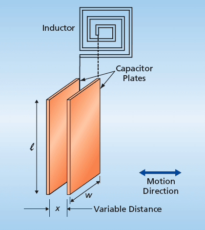 Both of the present position or displacement sensors consist essentially of variable rectangular parallel-plate capacitors electrically connected in series with fixed inductors. In the first sensor, (see Figure 1), the perpendicular distance, x, between the plates is variable and is the distance that one seeks to measure; alternatively, a change in this distance is the displacement that one seeks to measure. From the basic equations for the resonance angular frequency ω of an inductance-capacitance circuit and a first order approximation (fringing field neglected) of a parallel-plate capacitor, it can readily be shown that the distance is related to the resonance frequency by
