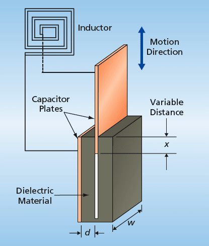 In the second sensor (see Figure 2), capacitor plates are constrained to remain at a perpendicular distance d, and one of the plates is free to slide parallel to the other one. The space between the plates is filled with a dielectric material of relative permittivity κ. In this case, the distance, x, that one seeks to measure is the length by which the plates overlap. Using the same approximations as those for the first sensor, it can be shown that the overlap length is related to the resonance frequency by