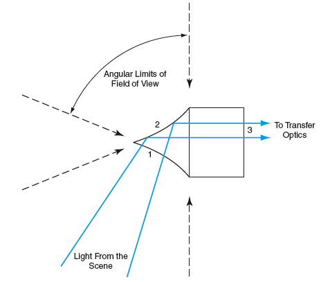 A PRO is a recently developed optic that operates partly like a PAL, partly like a fisheye lens, and partly like a convex mirror. In comparison with a PAL, a PRO provides a wider field of view, yet is simpler and can be fabricated at lower cost. As shown in Figure 2, light from a scene enters the optic at location 1 (where it is refracted), travels through the optic, is totally internally reflected at location 2, leaves the optic at location 3 (where it undergoes a small amount of refraction), then goes through the transfer optics and camera lens into the camera. The net effect of refraction and reflection from surfaces of the optic is to define the wide, approximately cylindrical field of view. The limits of the field of view are determined primarily by the index of refraction of the optic and the curvature of its refracting/reflecting surface. A significant issue that remains to be addressed in subsequent development efforts is that the resolution of the image is approximately inversely proportional to the angular width of the field of view.