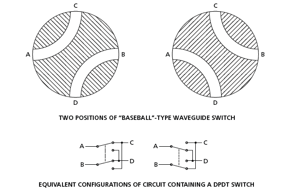 The mechanically actuated microwave switches in the original application would be two-position, four-port switches of a type known in the art as “baseball switches” because of the resemblance between their waveguide cross sections and the patterns of stitches on baseballs. Figure 1 depicts the two positions of a baseball switch and the corresponding positions of a nominally equivalent circuit containing a double-pole, double-throw (DPDT) switch.
