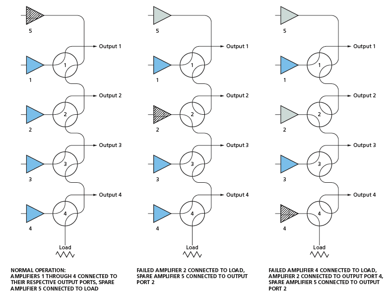 The core of the system is a switching scheme that utilizes a minimal number of switches to connect the amplifiers to the output ports. Specifically, it employs a four-port switch configuration that allows for two distinct connection setups, effectively routing signals from the amplifiers to the outputs. This design is particularly advantageous in applications requiring redundancy, as it simplifies the switching mechanism while ensuring that all amplifiers can be tested without the need for additional hardware.